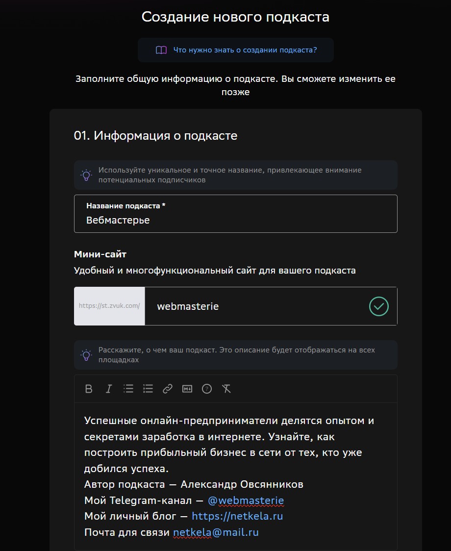 Вы попадаете в раздел где нужно заполнить информацию о вашем подкасте. Обязательные поля отмечены звездочкой.