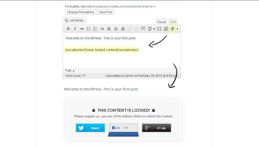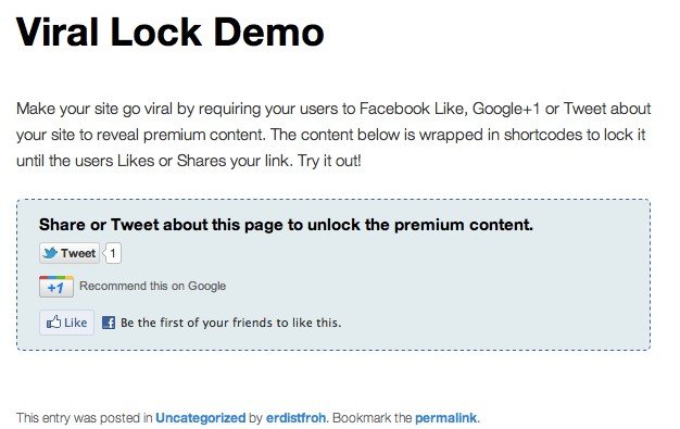 Его не нужно настраивать. Он сразу же переносится в редактор вордпресса. Чтобы скрыть контент, нужно обрамить его шорткодом [viral-lock]. Для просмотра посетителю необходимо разместить ссылку на материал в Twitter, Google+ либо Facebook. Замок сохраняет на устройстве посетителя куки, поэтому при повторном переходе на страницу его больше не будут беспокоить подобные просьбы.