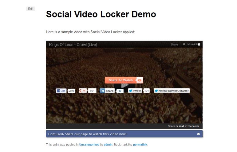 Замок закрывает доступ исключительно к видео, опубликованному на странице, пока посетитель не нажмет на кнопку Facebook, Google+, Twitter или Linkedln.