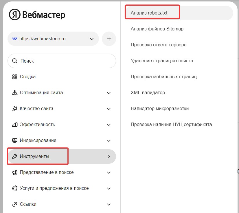 Чтобы перепроверить, получилось ли у вас закрыть свой сайт для Яндекса, добавьте его в Яндекс.Вебмастер, после чего зайдите в «Инструменты» и «Анализ robots.txt».