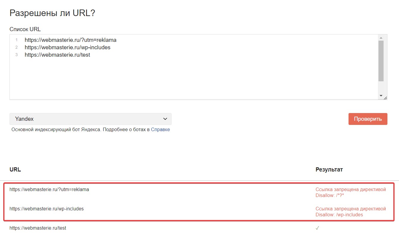 Вставьте несколько ссылок на страницы вашего ресурса, и нажмите «Проверить». Если они скрыты от ботов, напротив них в результатах вы увидите отмеченный результат красным цветом, который указывает, какая переменная закрывает эту страницу от индексации в robots.txt.