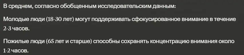 На эту тему мне нравится аналогия со временем и вниманием. Потому что это ограниченные ресурсы. Но если времени в сутках у тебя 24 часа всегда, то внимание с возрастом у тебя постоянно сокращается. Из своего опыта в среднем в молодом возрасте оно у меня составляло 6-8 часов, то сейчас примерно 4-5 часов.