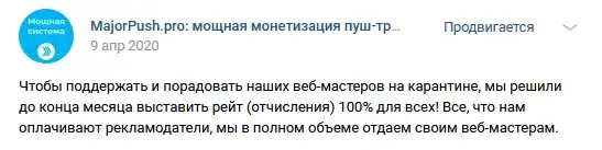 Мы же наоборот увеличили процент выплат до 100%. То есть лично мы в тот период вообще ничего не зарабатывали, а все отдавали своим вебмастерам.
