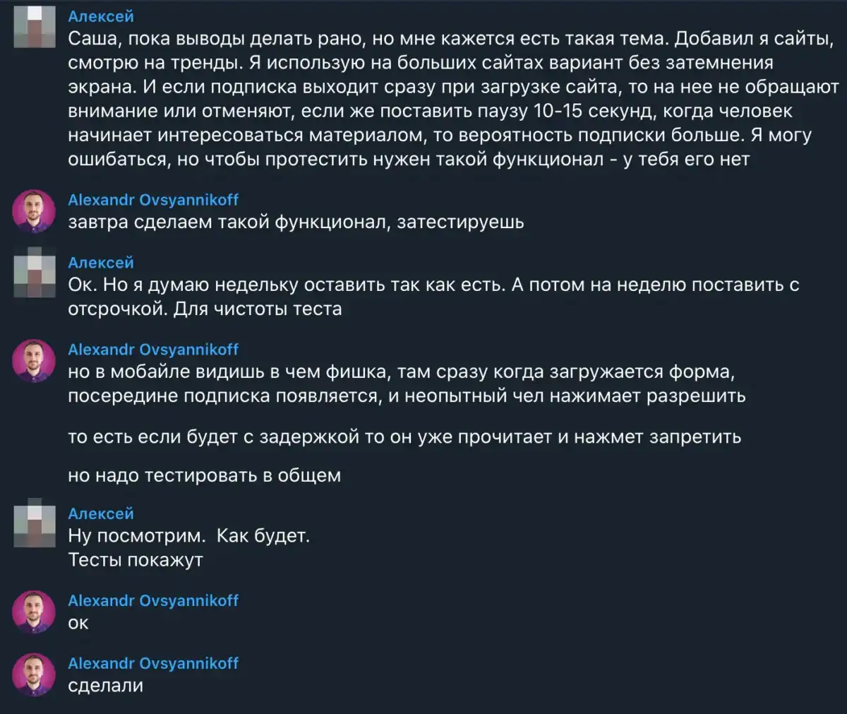 Так же например, мне написал вебмастер с предложением, сделать возможность отложенного показа формы подписки. У него была гипотеза, что так конверсия должна быть лучше. Мы это реализовали буквально за сутки и предоставили такой функционал.