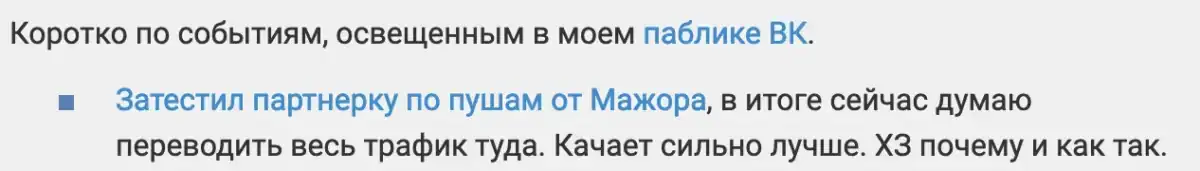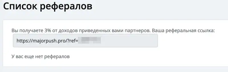 Еще в этом месяце мы оттестировали партнерскую программу. Теперь она у нас есть, и мы платим 3% от дохода привлеченного партнера в нашу систему MajorPush.pro (на данный момент проект продан).