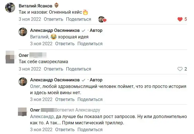 Но в этой истории еще интересно и другое. В комментариях появляется SEO-специалист и говорит, что это «так себе самореклама, лучше бы показал рост запросов».