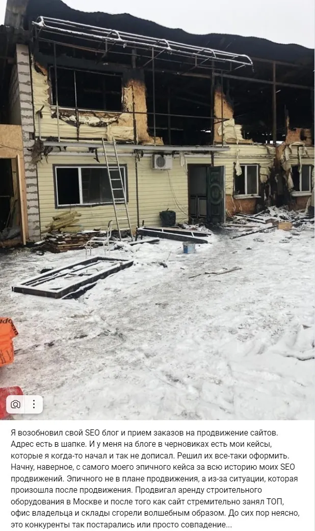 В подкасте с Петей я упомянул историю, как возвращался в клиентское SEO. Опубликовал фото сгоревшего офиса клиента.