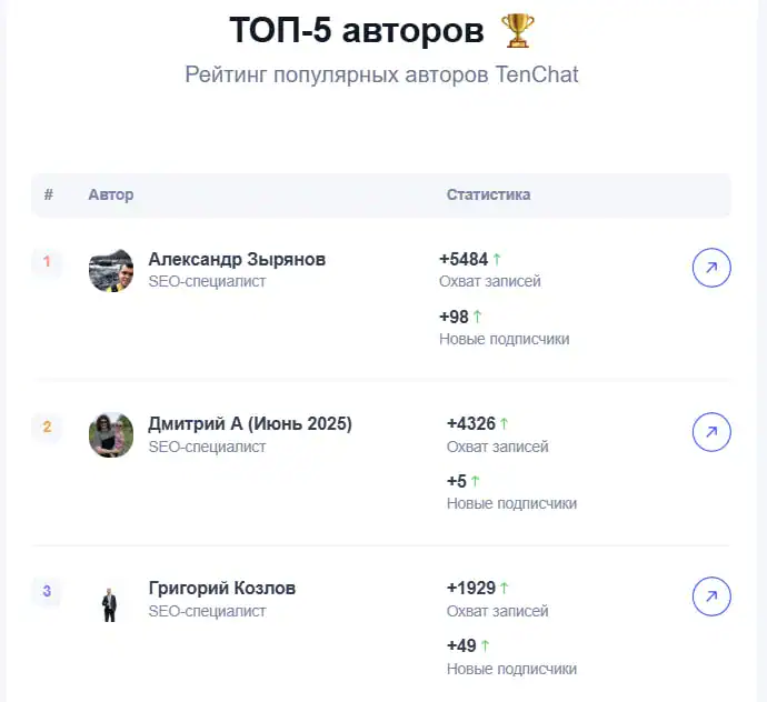 Если раньше в рейтинге ТОП SEO-спецов находились люди, которые писали полезный контент для бизнеса, то сейчас в рейтинг ТОП 1 стали подниматься авторы, злоупотребляющие спамом, вот пример такого аккаунта https://tenchat.ru/DimaSeo, который уже много месяцев держится в ТОП 1 авторов по SEO.