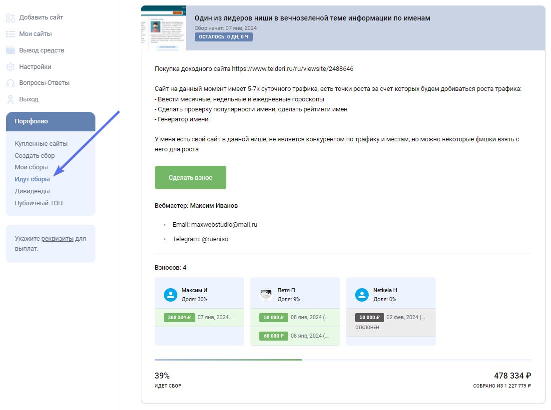 Как только инвестор находит потенциально интересный проект, он может выкупить его долю. Цены доли начинается от 50 000 ₽. Чем больше взнос, тем больше долю получит инвестор, а значит и процент от заработка сайта. Участники получают часть прибыли от сайта пропорционально своей инвестиции.