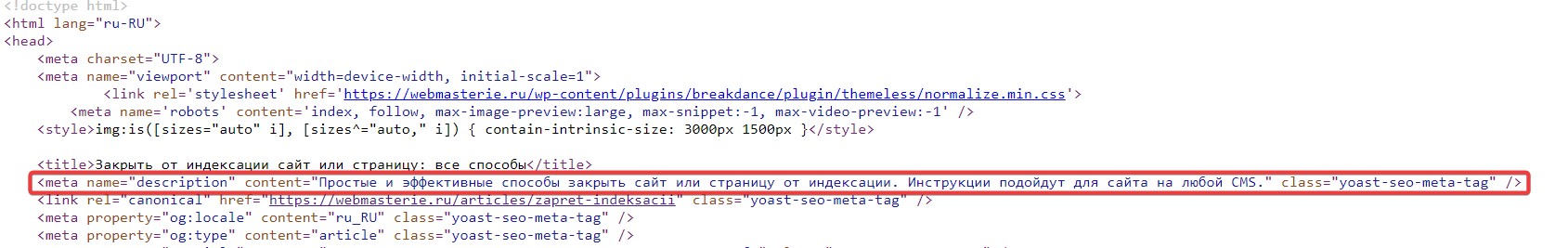 В коде выглядит так: <meta name="description" content="Описание страницы."/>.